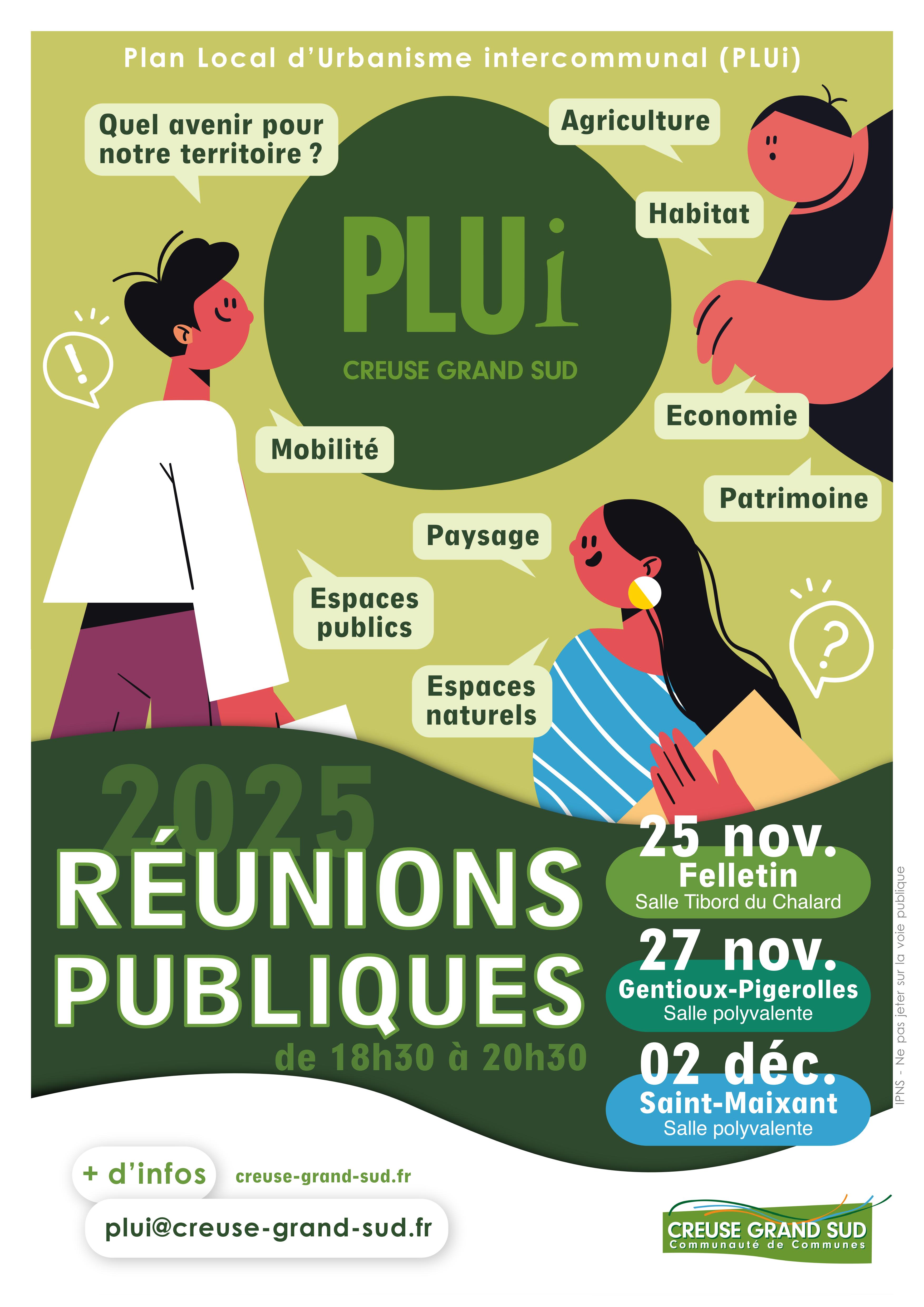 Pour en savoir plus, www.creuse-grand-sud.fr/urbanisme/plui ou par mail à plui(@)creuse-grand-sud.fr
