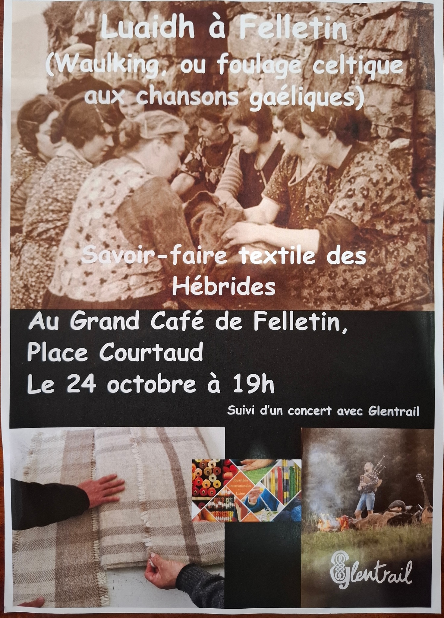 ►Une soirée évènement au Grand Café le vendredi 24 octobre avec à 19h – Démonstration de foulage (waulking) accompagnée de chansons gaéliques suivi à 20h d’un concert de musiques écossaises et irlandaises avec le groupe Glentrail.