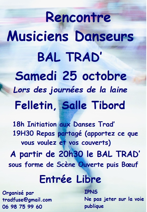 ►La rencontre musiciens danseurs et le bal trad organisés par Trad’Fuse le samedi 25 octobre à partir de 18h à l’espace Tibord du Chalard
