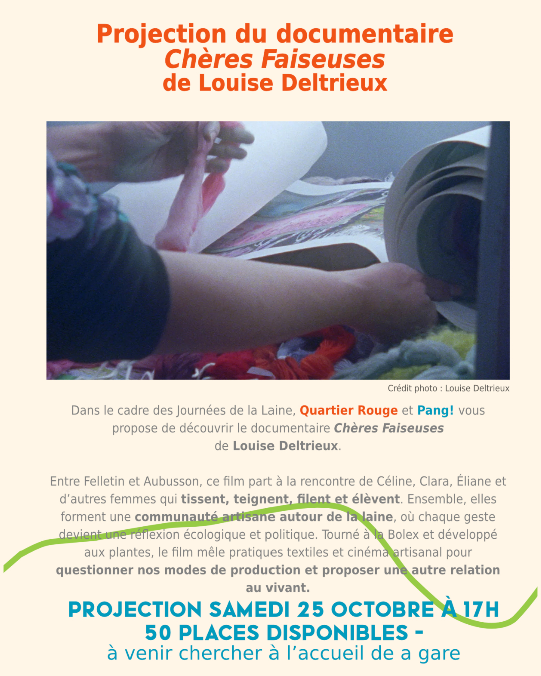 ►Une projection : “Chères faiseuses” de Louise Deltrieux. Un documentaire qui part à la rencontre de plusieurs femmes qui tissent, teignent, filent, entre Felletin et Aubusson. Proposée par PANG La Gare et Quartier Rouge