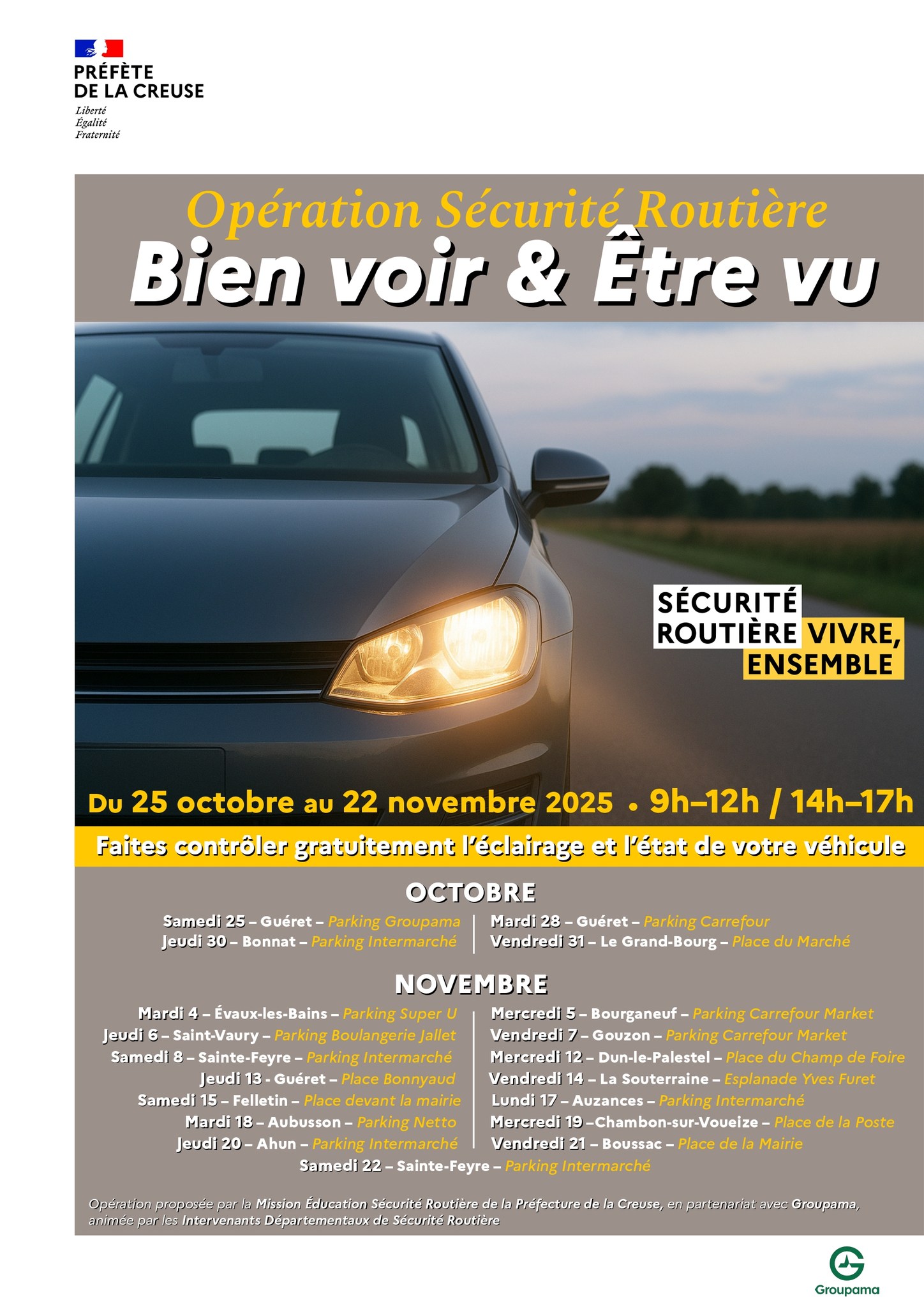La Mission Éducation et Sécurité Routière de la Préfecture de la Creuse, poursuit sa campagne « Bien voir & Être vu », en partenariat avec Groupama, en faisant une escale demain à Felletin,